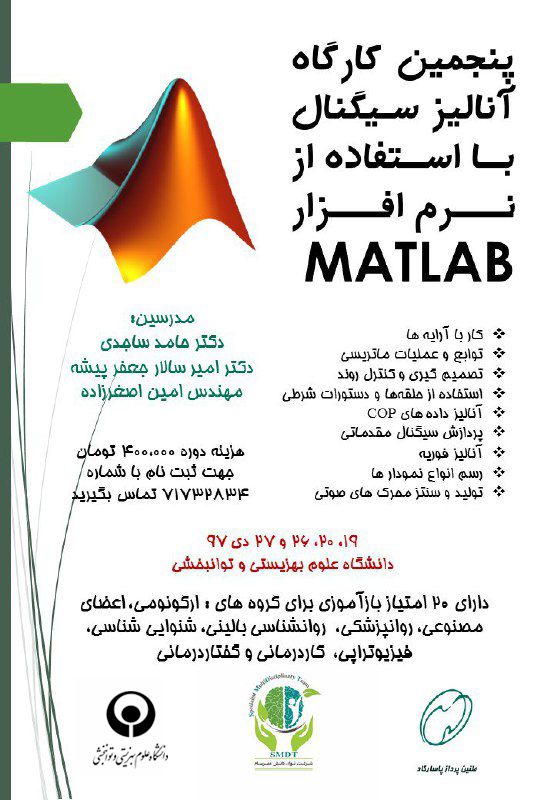 کارگاه پردازش سیگنال با استفاده از نرم افزار MATLAB، به همت شرکت دانش بنیان طنین پرداز پاسارگاد و شرکت دانش بنیان توان دانش مهرسام که از سابقه درخشان در زمینه ارائه خدمات آموزشی، مهندسی و فنی به جامعه متخصصان و محققان حوزه های پزشکی و توانبخشی برخوردارند، برگزار می شود.