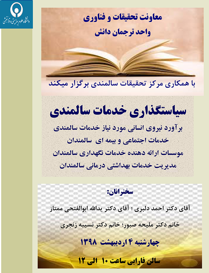 واحد " ترجمان دانش " معاونت تحقیقات و فناوری دانشگاه علوم بهزیستی و توانبخشی امروز (جمعه) طی اطلاعیه ای، به اعضای هیات علمی، محققان، دانشجویان و سایر علاقه مندان اعلام کرد که نشست " سیاستگذاری خدمات سالمندی"  از سلسله نشست های واحد ترجمان دانش،  از ساعت 10 الی 12 روز  چهارشنبه چهارم اردیبهشت ماه در سالن اجتماعات فارابی برگزار می شود.