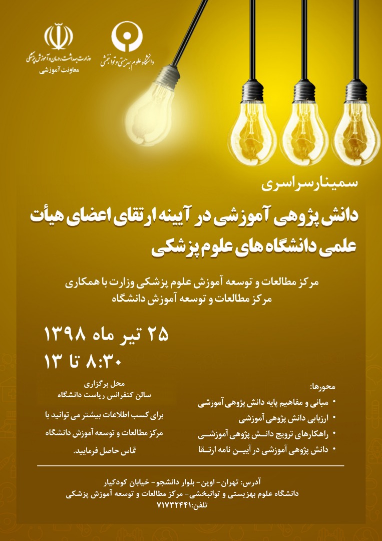 اخبار > سمینار سراسری "دانش پژوهی آموزشی در آیینه ارتقای اعضای هیات علمی " دانشگاه های علوم پزشکی، فردا (سه شنبه) برگزار می شود