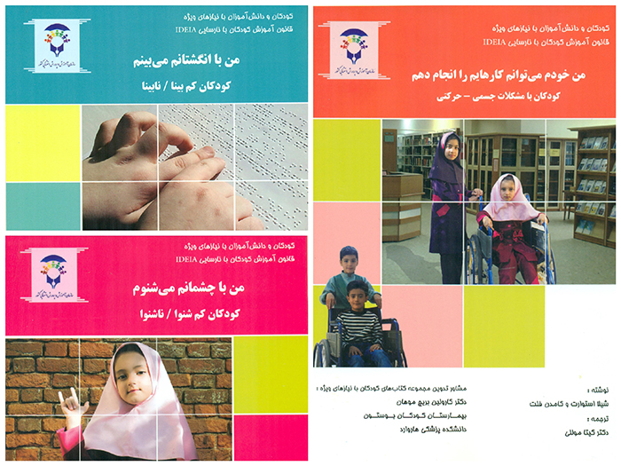 " من با انگشتانم می بینم، کودکان کم بینا / نابینا " ، " من با چشمانم می شنوم ، کودکان کم شنوا / ناشنوا " و " من خودم می توانم کارهایم را انجام دهم ، کودکان با مشکلات جسمی – حرکتی "، عنوان کتاب های مذکور است که  به قلم " شیلا استوارت و کامدن فلت " نوشته شده و توسط  دکتر گیتا موللی ترجمه شده اند.