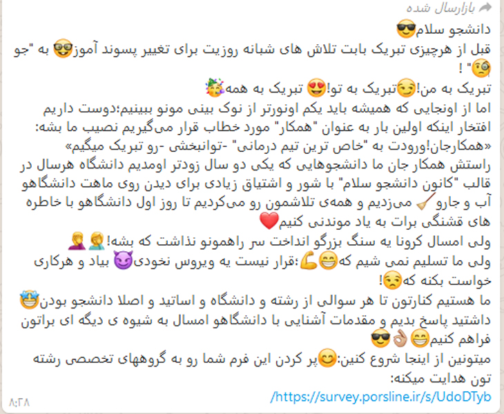 کانون دانشجو سلام ، لینک   https://survey.porsline.ir/s/UdoDTyb/     را برای برقراری ارتباط با دانشجویان جدید الورود دانشگاه و تقسیم بندی آنان براساس رشته تحصیلی و شرایط هریک، جهت همراهی بهتر و مناسب تر، اعلام کرده است.