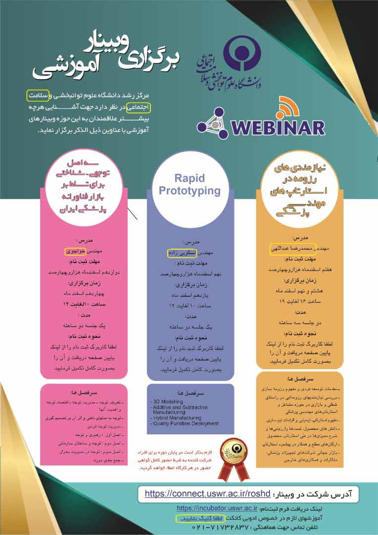 مرکز رشد دانشگاه همچنین در این اطلاعیه، لینک   https://connect.uswr.ac.ir/roshd  را برای شرکت در وبینار و شماره تلفن 71732837 -021  را جهت هماهنگی های بیشتر، اعلام کرد.