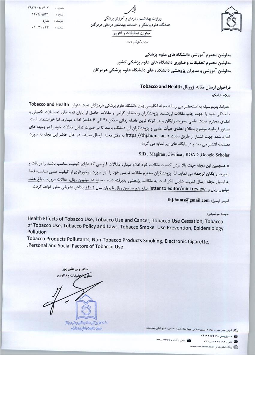 فراخوان ارسال مقاله - مجله علمي پژوهشي Tobacco and Health