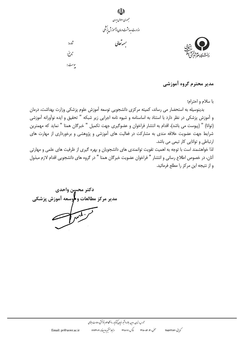 قابل توجه کلیه دانشجویان رشته های پرستاری مدارک لازم جهت تسویه حساب از دفتر گروه آموزشی پرستاری به شرح زیر میباشد - 1 نسخه پایان نامه صحافی شده که در دو طرف مجلد اطلاعات کامل دانشجو به فارسی وانگلیسی چاپ شده باشد - 1 حلقه DVD شامل : - پایان نامه با فرمت word و pdf ، - Extract فارسی با هر دو فرمت word و pdf - extract انگلیسی با هر دو فرمت word و pdf - فایل powerpoint دفاع - فایل Data SPSS - فایل مقاله