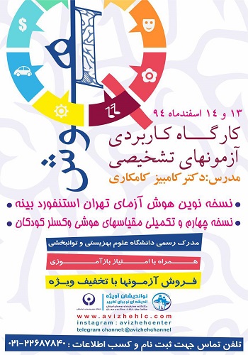 کارگاه کاربردی آزمون های تشخیصی هوش (نسخه نوین هوش آزمای تهران استنفورد بینه، نسخه چهارم و تکمیلی مقیاسهای هوشی وکسلر کودکان ) طی روزهای 13 و 14 اسفندماه جاری در دانشگاه علوم بهزیستی و توانبخشی برگزار می شود.